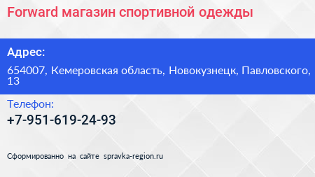 Forward, магазин спортивной одежды по адресу 654007, Кемеровская область, Новокузнецк, Павловского, 13 в дальнейшем Организация, размещена в следующих категориях: