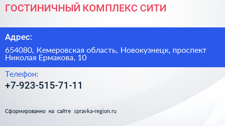 ГОСТИНИЧНЫЙ КОМПЛЕКС СИТИ по адресу 654080, Кемеровская область, Новокузнецк, проспект Николая Ермакова, 10 в дальнейшем Организация, размещена в следующих категориях: