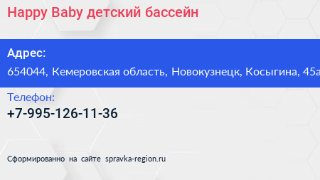 Happy Baby, детский бассейн по адресу 654044, Кемеровская область, Новокузнецк, Косыгина, 45а в дальнейшем Организация, размещена в следующих категориях: