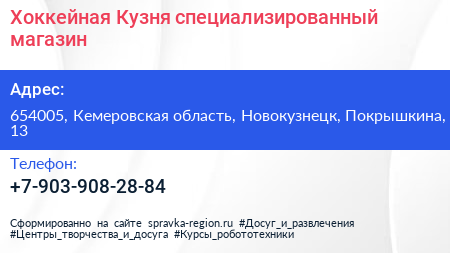 Хоккейная Кузня, специализированный магазин по адресу 654005, Кемеровская область, Новокузнецк, Покрышкина, 13 в дальнейшем Организация, размещена в следующих категориях: