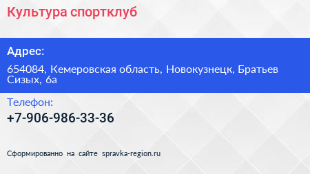 Культура, спортклуб по адресу 654084, Кемеровская область, Новокузнецк, Братьев Сизых, 6а в дальнейшем Организация, размещена в следующих категориях: