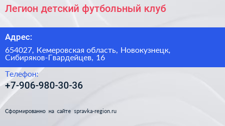 Легион, детский футбольный клуб по адресу 654027, Кемеровская область, Новокузнецк, Сибиряков-Гвардейцев, 16 в дальнейшем Организация, размещена в следующих категориях: