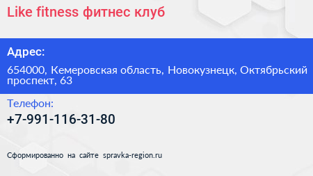 Like fitness, фитнес-клуб по адресу 654000, Кемеровская область, Новокузнецк, Октябрьский проспект, 63 в дальнейшем Организация, размещена в следующих категориях: