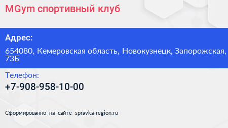 MGym, спортивный клуб по адресу 654080, Кемеровская область, Новокузнецк, Запорожская, 73Б в дальнейшем Организация, размещена в следующих категориях: