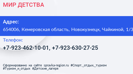 МИР ДЕТСТВА по адресу 654006, Кемеровская область, Новокузнецк, Чайкиной, 1/3 в дальнейшем Организация, размещена в следующих категориях: