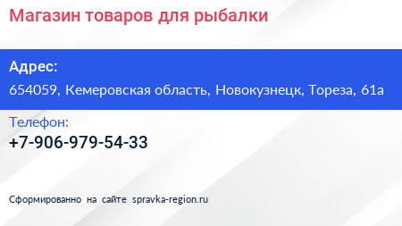 Магазин товаров для рыбалки по адресу 654059, Кемеровская область, Новокузнецк, Тореза, 61а в дальнейшем Организация, размещена в следующих категориях: