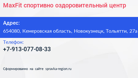 MaxFit, спортивно-оздоровительный центр по адресу 654080, Кемеровская область, Новокузнецк, Тольятти, 27а в дальнейшем Организация, размещена в следующих категориях: