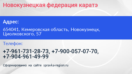 Новокузнецкая федерация каратэ по адресу 654041, Кемеровская область, Новокузнецк, Циолковского, 57 в дальнейшем Организация, размещена в следующих категориях: