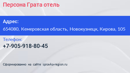 Персона Грата, отель по адресу 654080, Кемеровская область, Новокузнецк, Кирова, 105 в дальнейшем Организация, размещена в следующих категориях: