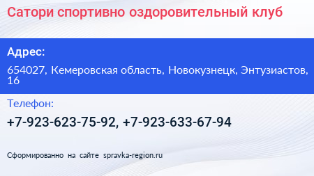 Сатори, спортивно-оздоровительный клуб по адресу 654027, Кемеровская область, Новокузнецк, Энтузиастов, 16 в дальнейшем Организация, размещена в следующих категориях: