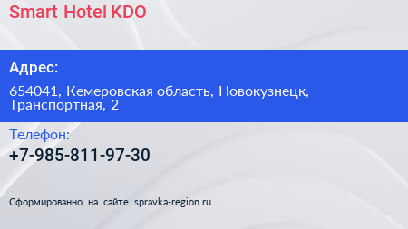 Smart Hotel KDO по адресу 654041, Кемеровская область, Новокузнецк, Транспортная, 2 в дальнейшем Организация, размещена в следующих категориях: