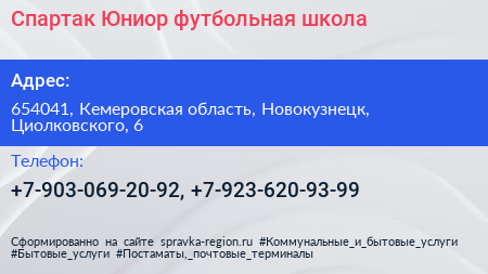 Спартак Юниор, футбольная школа по адресу 654041, Кемеровская область, Новокузнецк, Циолковского, 6 в дальнейшем Организация, размещена в следующих категориях: