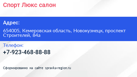 Спорт-Люкс, салон по адресу 654005, Кемеровская область, Новокузнецк, проспект Строителей, 84а в дальнейшем Организация, размещена в следующих категориях: