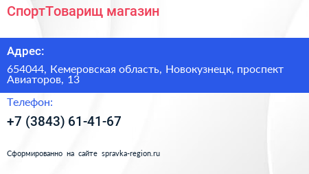 СпортТоварищ, магазин по адресу 654044, Кемеровская область, Новокузнецк, проспект Авиаторов, 13 в дальнейшем Организация, размещена в следующих категориях: