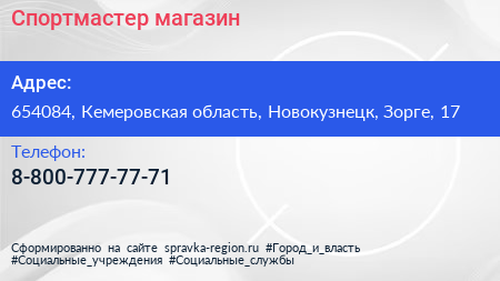 Спортмастер, магазин по адресу 654084, Кемеровская область, Новокузнецк, Зорге, 17 в дальнейшем Организация, размещена в следующих категориях: