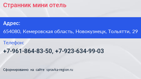 Странник, мини-отель по адресу 654080, Кемеровская область, Новокузнецк, Тольятти, 29 в дальнейшем Организация, размещена в следующих категориях: