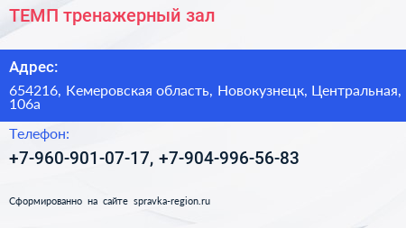 ТЕМП, тренажерный зал по адресу 654216, Кемеровская область, Новокузнецк, Центральная, 106а в дальнейшем Организация, размещена в следующих категориях:
