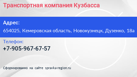Транспортная компания Кузбасса по адресу 654025, Кемеровская область, Новокузнецк, Дузенко, 18а в дальнейшем Организация, размещена в следующих категориях: