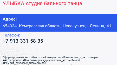 УЛЫБКА, студия бального танца по адресу 654034, Кемеровская область, Новокузнецк, Ленина, 41 в дальнейшем Организация, размещена в следующих категориях: