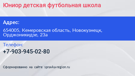 Юниор, детская футбольная школа по адресу 654005, Кемеровская область, Новокузнецк, Орджоникидзе, 23а в дальнейшем Организация, размещена в следующих категориях: