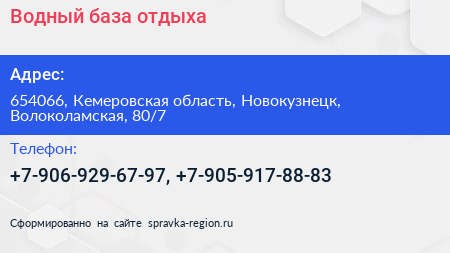 Водный, база отдыха по адресу 654066, Кемеровская область, Новокузнецк, Волоколамская, 80/7 в дальнейшем Организация, размещена в следующих категориях: