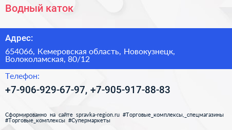 Водный, каток по адресу 654066, Кемеровская область, Новокузнецк, Волоколамская, 80/12 в дальнейшем Организация, размещена в следующих категориях: