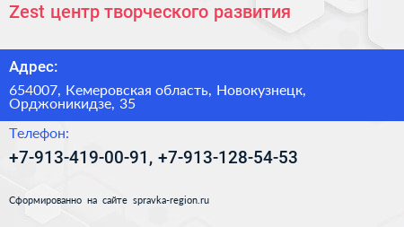 Zest, центр творческого развития по адресу 654007, Кемеровская область, Новокузнецк, Орджоникидзе, 35 в дальнейшем Организация, размещена в следующих категориях: