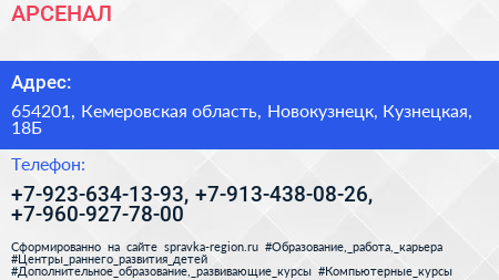 АРСЕНАЛ по адресу 654201, Кемеровская область, Новокузнецк, Кузнецкая, 18Б в дальнейшем Организация, размещена в следующих категориях: