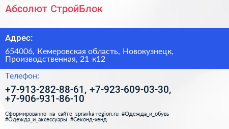 Абсолют & СтройБлок по адресу 654006, Кемеровская область, Новокузнецк, Производственная, 21 к12 в дальнейшем Организация, размещена в следующих категориях: