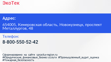 ЭкоТек по адресу 654005, Кемеровская область, Новокузнецк, проспект Металлургов, 48 в дальнейшем Организация, размещена в следующих категориях: