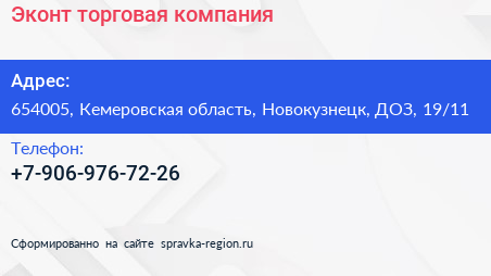 Эконт, торговая компания по адресу 654005, Кемеровская область, Новокузнецк, ДОЗ, 19/11 в дальнейшем Организация, размещена в следующих категориях: