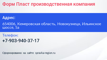 Форм Пласт, производственная компания по адресу 654006, Кемеровская область, Новокузнецк, Ильинское шоссе, 5а в дальнейшем Организация, размещена в следующих категориях: