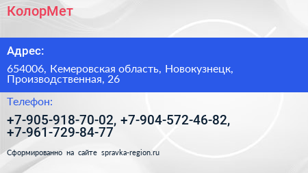 КолорМет по адресу 654006, Кемеровская область, Новокузнецк, Производственная, 26 в дальнейшем Организация, размещена в следующих категориях: