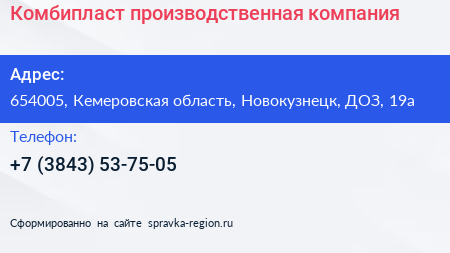 Комбипласт, производственная компания по адресу 654005, Кемеровская область, Новокузнецк, ДОЗ, 19а в дальнейшем Организация, размещена в следующих категориях: