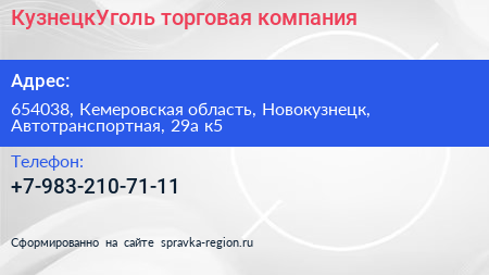 КузнецкУголь, торговая компания по адресу 654038, Кемеровская область, Новокузнецк, Автотранспортная, 29а к5 в дальнейшем Организация, размещена в следующих категориях: