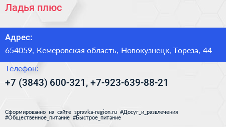Ладья плюс по адресу 654059, Кемеровская область, Новокузнецк, Тореза, 44 в дальнейшем Организация, размещена в следующих категориях: