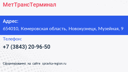 МетТрансТерминал по адресу 654010, Кемеровская область, Новокузнецк, Музейная, 9 в дальнейшем Организация, размещена в следующих категориях: