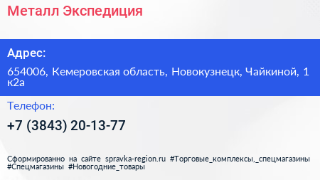 Металл Экспедиция по адресу 654006, Кемеровская область, Новокузнецк, Чайкиной, 1 к2а в дальнейшем Организация, размещена в следующих категориях: