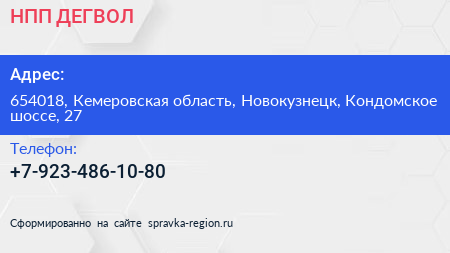 НПП ДЕГВОЛ по адресу 654018, Кемеровская область, Новокузнецк, Кондомское шоссе, 27 в дальнейшем Организация, размещена в следующих категориях: