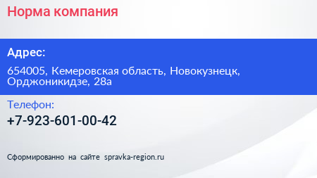 Норма, компания по адресу 654005, Кемеровская область, Новокузнецк, Орджоникидзе, 28а в дальнейшем Организация, размещена в следующих категориях: