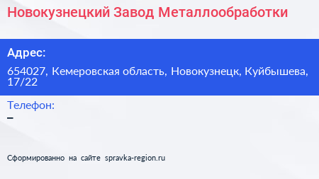 Новокузнецкий Завод Металлообработки по адресу 654027, Кемеровская область, Новокузнецк, Куйбышева, 17/22 в дальнейшем Организация, размещена в следующих категориях: