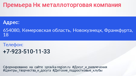 Премьера-Нк, металлоторговая компания по адресу 654080, Кемеровская область, Новокузнецк, Франкфурта, 18 в дальнейшем Организация, размещена в следующих категориях: