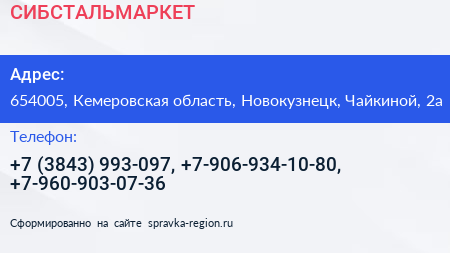 СИБСТАЛЬМАРКЕТ по адресу 654005, Кемеровская область, Новокузнецк, Чайкиной, 2а в дальнейшем Организация, размещена в следующих категориях:
