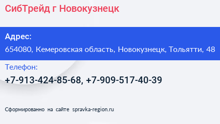 СибТрейд, г. Новокузнецк по адресу 654080, Кемеровская область, Новокузнецк, Тольятти, 48 в дальнейшем Организация, размещена в следующих категориях: