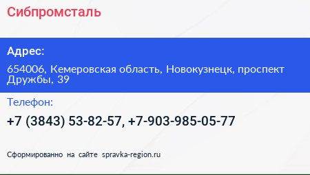 Сибпромсталь по адресу 654006, Кемеровская область, Новокузнецк, проспект Дружбы, 39 в дальнейшем Организация, размещена в следующих категориях:
