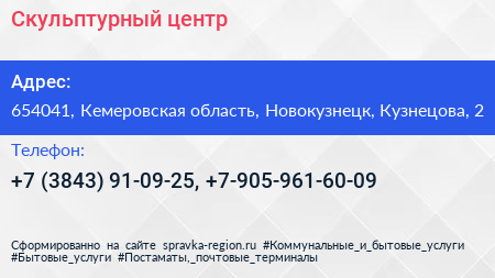 Скульптурный центр по адресу 654041, Кемеровская область, Новокузнецк, Кузнецова, 2 в дальнейшем Организация, размещена в следующих категориях: