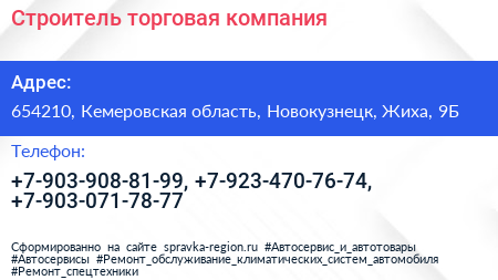 Строитель, торговая компания по адресу 654210, Кемеровская область, Новокузнецк, Жиха, 9Б в дальнейшем Организация, размещена в следующих категориях: