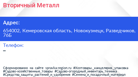Вторичный Металл по адресу 654002, Кемеровская область, Новокузнецк, Разведчиков, 76Б в дальнейшем Организация, размещена в следующих категориях: