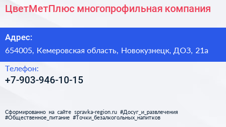 ЦветМетПлюс, многопрофильная компания по адресу 654005, Кемеровская область, Новокузнецк, ДОЗ, 21а в дальнейшем Организация, размещена в следующих категориях: