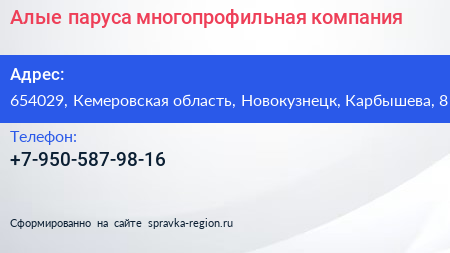 Алые паруса, многопрофильная компания по адресу 654029, Кемеровская область, Новокузнецк, Карбышева, 8 в дальнейшем Организация, размещена в следующих категориях: